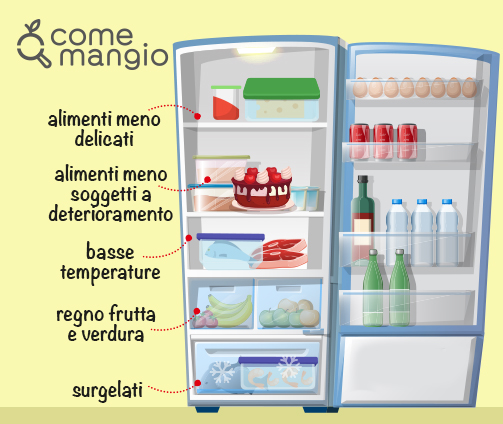 Una ripartizione degli alimenti fra le varie aree del frigorifero può essere la seguente: