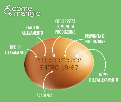 La sigla IT ci dice che le uova provengono dall’Italia, il numero 0.99 è il codice ISTAT del Comune di produzione, la sigla PC rievoca quelle che molti anni fa trovavamo sulle targhe delle nostre automobili e definisce la provincia dove ha sede l’allevamento, infine l’ultima stringa numerica permette di risalire all’allevamento, così da intervenire in modo rapido e mirato qualora sorgessero problemi di sicurezza alimentare. Inoltre, sull’uovo va riportata anche la data di scadenza.