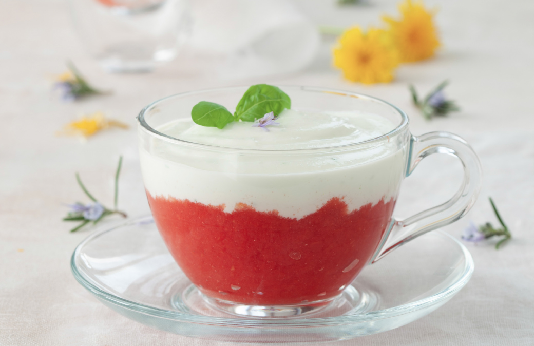 Prendere la dadolata di pomodoro, frullarla fino a ottenere una purea, salare quanto basta. Dividere il composto in quattro bicchieri trasparenti, trasferire in frigorifero e lasciare riposare. Setacciare la ricotta insieme allo yogurt, unire le foglie di basilico e menta lavate e asciugate. Frullare per ottenere un composto omogeneo e cremoso.3
