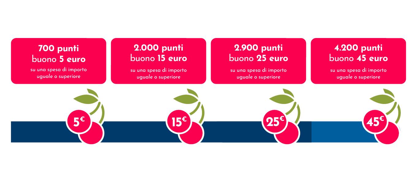 Dal 3 Marzo al 31 Dicembre 2025, ogni volta che effettui un acquisto accumuli 1 punto ciliegia per ogni Euro speso, senza soglia minima di spesa.