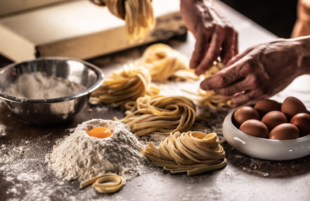Niente dà più soddisfazione in cucina che mettere, letteralmente, le mani in pasta. Partendo da pochi, semplici ingredienti, si ottengono bocconi golosi dai mille formati e sapori: la pasta fresca, ripiena e non, dall’impasto con uova o senza. Una tradizione che parte da lontano e attraversa tutte le regioni: mescolando farina e acqua, gli Etruschi confezionavano lunghi nastri di pasta, chiamati lagana, che cuocevano in un brodo di verdure. Ne andavano matti anche i Romani, Cicerone in primis, e la pasta fresca divenne parte del corredo di conoscenze di ogni ragazza da marito.