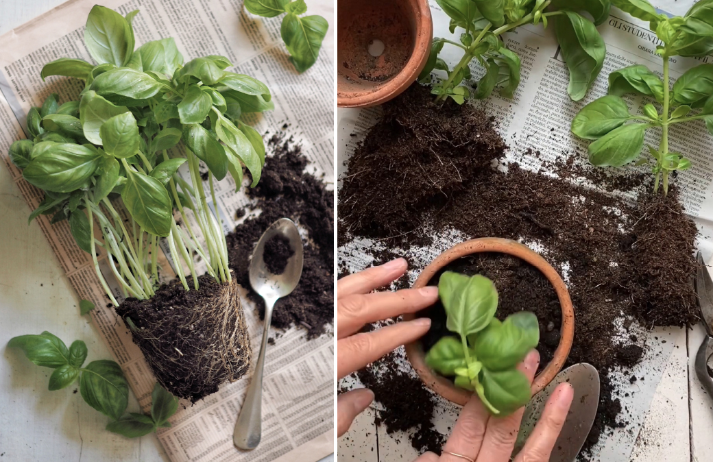 Le piante vanno poi travasate in un vaso di terracotta poco più grande per far traspirare meglio il terriccio. Il consiglio è di acquistare un vaso ancora più grande, capace di ospitare tante piantine, e poi dividere il basilico: separate delicatamente il pane di terra cercando di non rompere le radici di ogni singolo stelo e ripiantate subito nel vaso in cui aggiungerete un fondo drenante. Completate invasando con buona terra. Bagnate quando il terriccio è bene asciutto: la maggior parte dei problemi con la coltivazione del basilico, infatti, risiede proprio nel dare troppa acqua da bere alla pianta.