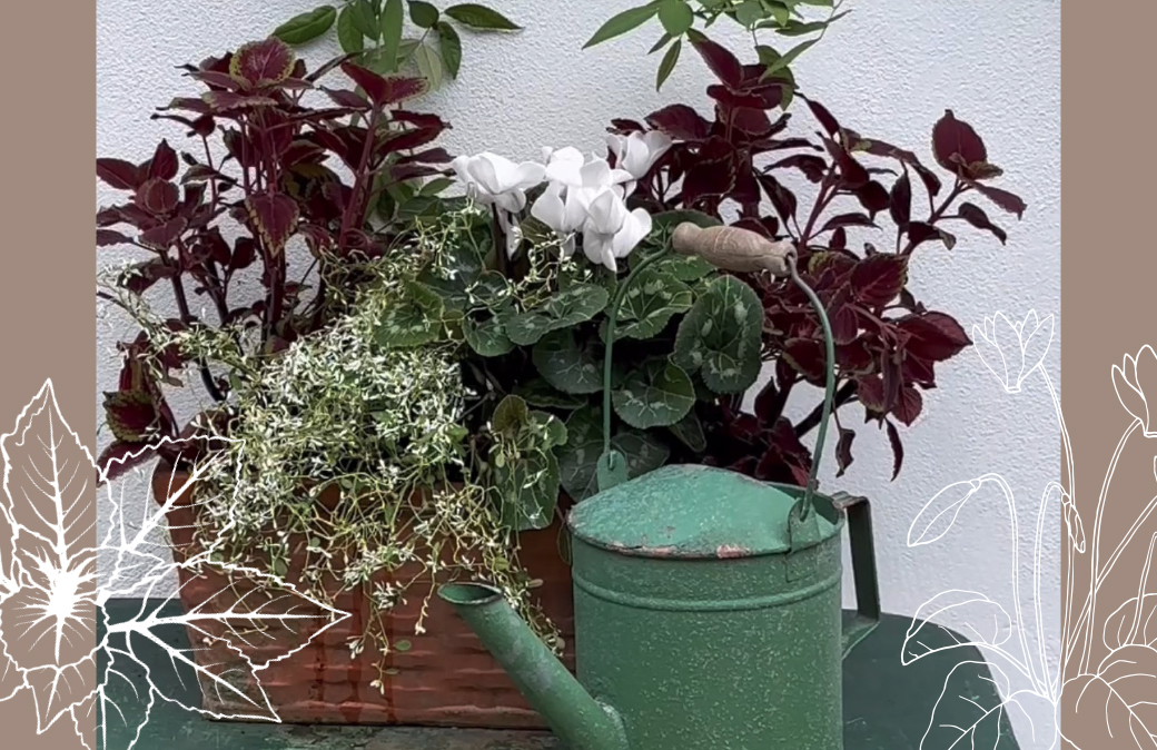 la delicatezza del ciclamino contrasta con il fogliame deciso del coleus, mentre l’euphorbia aggiunge un tocco leggero e vaporoso, simile a una nebbia sottile. Una composizione ideale per balconi e ingressi riparati, dove possa essere ammirata da vicino.