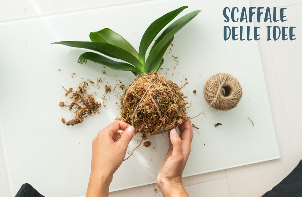 Posiziona le radici dell’orchidea attorno alla sfera di terriccio e avvolgile delicatamente con il muschio vivo. Fissa il tutto con il filo di cotone, avvolgendolo senza stringere troppo, per mantenere compatto il kokedama. - Innaffia correttamente
