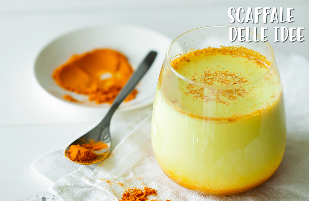 Frulla insieme, anche con un montalatte elettrico, 1 tazza di latte vaccino (o di cocco o mandorle, non zuccherato, se sei vegan), 1 cucchiaino di olio di cocco, 1/2 cucchiaino di curcuma in polvere, 1 grosso pizzico di pepe nero macinato fresco, 1 pezzetto da ½ cm di radice di zenzero sbucciata e grattugiata, 1 grosso pizzico di cardamomo in polvere e 1 grosso pizzico di cannella in polvere. Metti su fuoco basso e fai sobbollire molto dolcemente (non bollire) per 15 minuti. Versa in una tazza e aggiungi una punta di cucchiaino di miele.