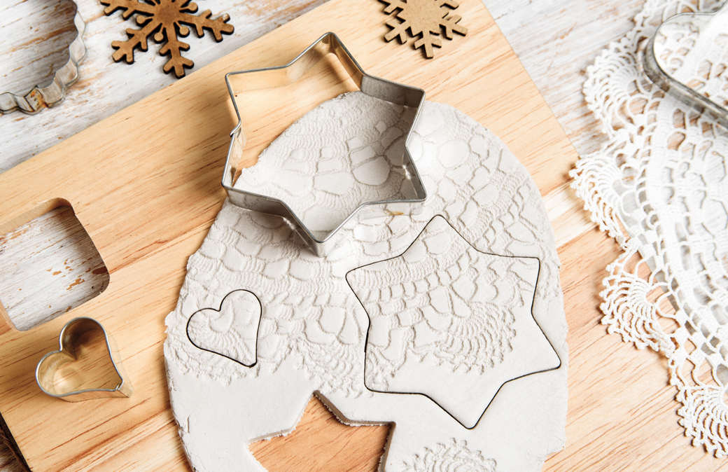 • Prelevare di volta in volta la quantità che serve: stenderla con un matterello, incidere con la punta di uno spiedino di legno una decorazione fantasia, ritagliarla con le formine dei biscotti, completare con un foro