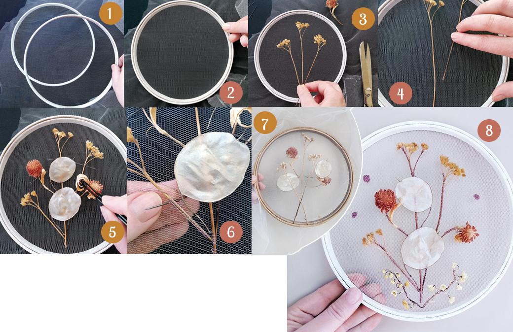 6 Con ago e filo, fissate i rametti alla rete di tulle, avvolgendo il filo intorno con piccoli punti regolari. Eliminate gli spilli.