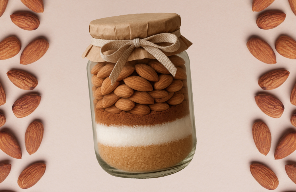 • Carta da pacchi • Barattolo di vetro da 250 ml • Nastro• 1 cucchiaino di cannella • 100 g di mandorle non pelate • 35 g di zucchero • 35 g di zucchero di canna grezzo