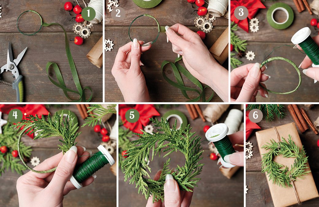 1 Ecco che cosa serve: rami di sempreverde (qui utilizziamo quelli di tuia, ma vanno bene anche abete, pino, ginepro...); cesoie; fil di ferro da fiorista; nastro di carta verde da fiorista; colla; spago da imballaggio; carta da pacco. Si comincia creando un cerchietto con il fil di ferro.