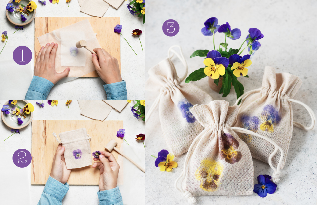 OCCORRENTE: martelletto in legno • carta forno • sacchettino di lino • fiori freschi