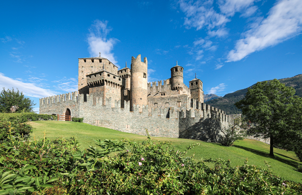 È il più famoso, fotografato e visitato, perfetta location anche di film e fiction. Una vocazione scenografica che risale alla sua origine: a dispetto di mura, merli e torri, Fénis non è mai stata una fortezza, bensì la sede di rappresentanza degli Challant, feudatari del luogo. Il loro status symbol. Di rappresentanza anche gli affreschi del cortile dove, come in un’enciclopedia illustrata, si mischiano i saperi: Oriente e Occidente, cultura alta e sapienza rurale. Tanto che nel prato, ai piedi delle figure che rappresentano i sapienti (tra cui, forse, l’arabo Averroè), vengono dipinte minuziosamente centinaia di erbe ed essenze officinali che crescono nella valle.