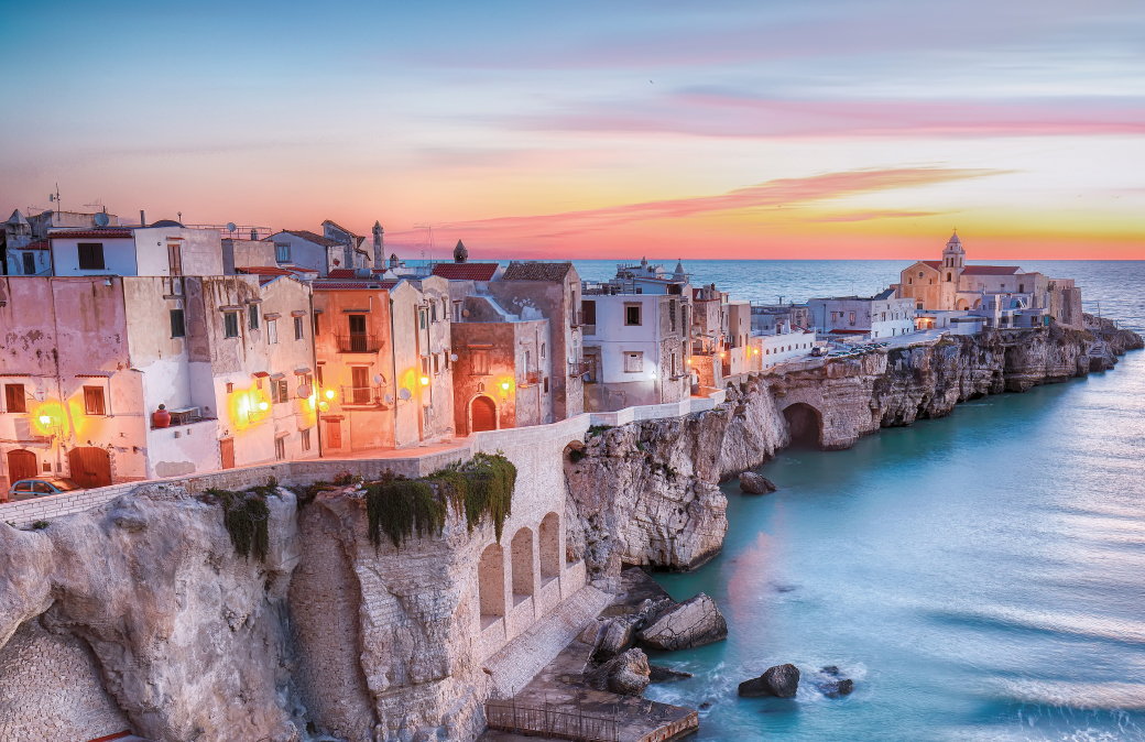 E adesso prendiamo una carta d’Europa. Evidenziamo tre punti: Mont Saint Michel in Normandia, la Sacra di San Michele in Val di Susa e Monte Sant’Angelo in Gargano. Se li colleghiamo tra loro vediamo che sono perfettamente allineati ed equidistanti. È la cosiddetta Linea Micaelica, sorta di meridiano della fede che affonda le sue radici nel Medioevo. Monte Sant’Angelo (infopoint tel. 0884562062) è uno dei luoghi più suggestivi del Gargano, ricchissimo di testimonianze storico-artistiche come il complesso basilicale di San Pietro, risalente all’epoca longobarda. Il suo centro storico sale dai rioni dalle tipiche case imbiancate a calce fino al castello normanno-aragonese-angioino che sovrasta l’abitato. E, nelle viscere della terra, c’è la Grotta dell’Angelo, luogo carico di suggestione anche per un non credente (santuariosanmichele.it). Stesso discorso per il vicino San Giovanni Rotondo, legato alla figura di san Pio da Pietrelcina. Meta di pellegrini da tutto il mondo, accolti dalla chiesa disegnata da Renzo Piano con il crocifisso di Arnaldo Pomodoro e i mosaici di Marko Rupnik (conventosantuariopadrepio.it).
