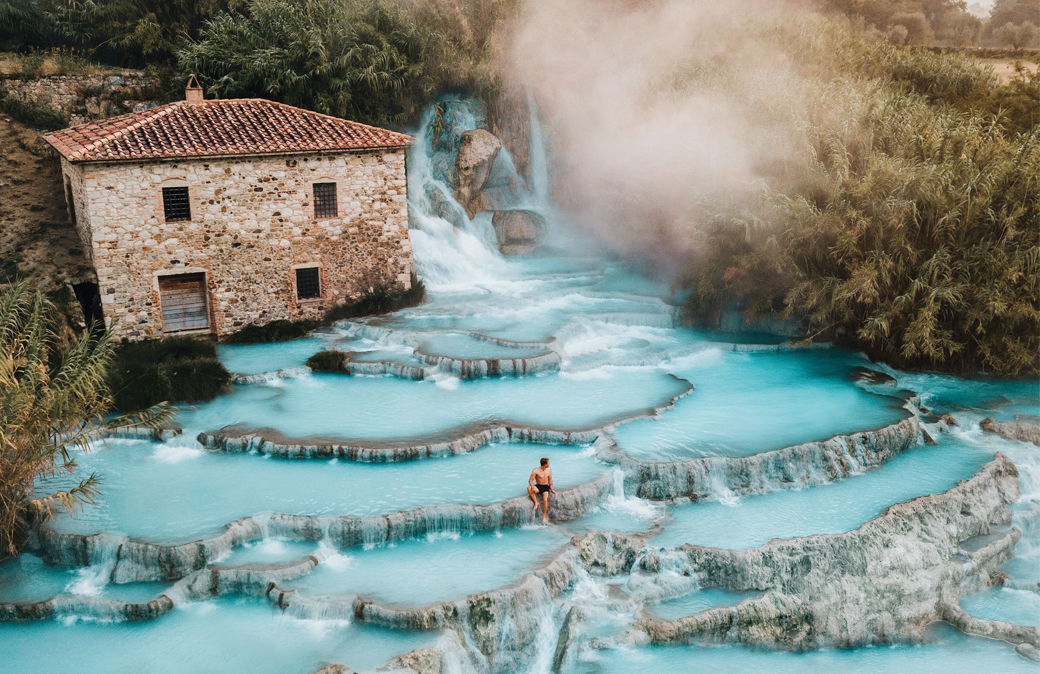 Quarant’anni. Tanto ci mette una goccia di pioggia caduta sul monte Amiata per arricchirsi di minerali e riscaldarsi prima di sgorgare dalle viscere della terra a 37,5°C, la stessa temperatura del grembo materno. Goccia che, insieme a miliardi di altre gocce, diventa un flusso costante di quasi 800 litri al secondo che determina ogni 4 ore un ricambio completo dell’acqua nella piscina-sorgente: garanzia di purezza assoluta. È il “miracolo” di Saturnia, la località termale del comune di Manciano, nella Maremma grossetana, nota per le sue proprietà benefiche fin dall’epoca etrusca e romana.