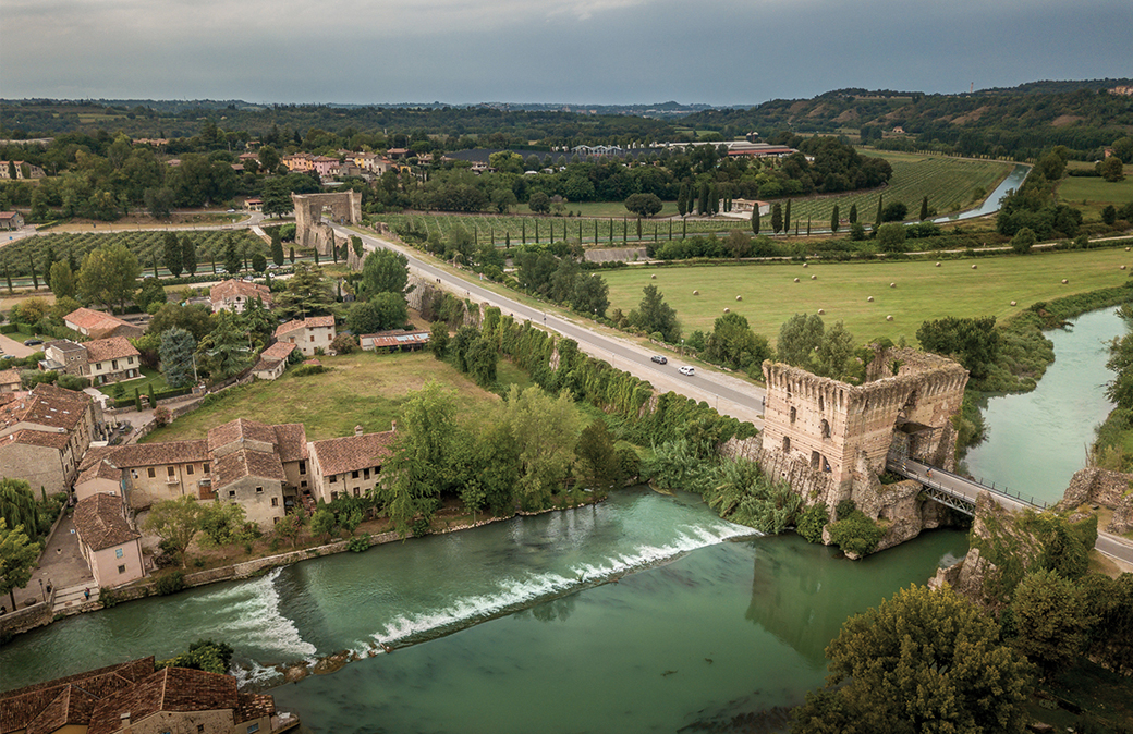 Base per escursioni in questo territorio, magari in sella a una bicicletta, è senz’altro Valeggio sul Mincio (sponda veronese), toccato dalla pista ciclabile Peschiera-Mantova che con i suoi 40 km interamente protetti può essere scelta per un approccio turistico eco e slow. Stesso discorso, ma qui si tratta di strade aperte al traffico (anche se solo locale), per il Circuito delle Terre del Custoza. Valeggio sorge sul rilievo che domina l’antico guado del fiume. Ragion per cui gli Scaligeri, prima, e i Visconti poi dotarono il borgo di un possente sistema di fortificazioni che in parte è rimasto. Ai signori di Verona si deve il cosiddetto Serraglio: serie di torri, mura e fortezze che andava da Sirmione a Grezzano al cui centro c’era appunto Valeggio e il suo castello di cui oggi restano tre torri. Dalla loro sommità la veduta è spettacolare. A nord il Mincio fino ai castelli di Monzambano e Ponti, a est la piana veronese e Villafranca, a sud la pianura mantovana. A ovest, ai piedi del colle, il Ponte Visconteo, altra opera militare realizzata nel ‘300 dai duchi di Milano, subentrati agli Scaligeri nel dominio del territorio. Lungo 650 m e largo una ventina è una costruzione ciclopica. Due rocche presidiano le