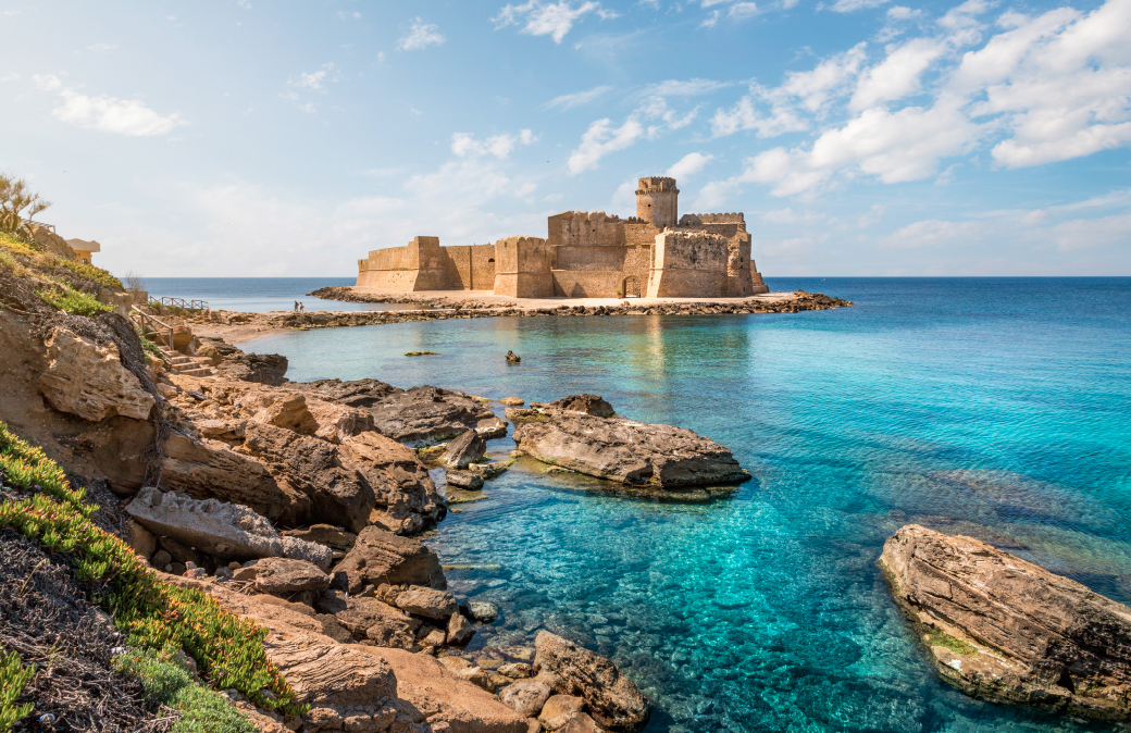 Siamo a Le Castella, strategico baluardo proteso nel mare Jonio a guardia della costa di Capo Rizzuto: un muro greco nelle fondamenta testimonia l’antichità dell’insediamento, la cui forma attuale risale al dominio aragonese (XV sec.). Oggi, al posto dei pirati saraceni, deve difendersi solamente dall’assalto di migliaia di turisti che ne fanno una meta imprescindibile delle loro vacanze su una delle più belle coste calabresi. Proprio il litorale attorno a Capo Rizzuto è infatti area marina protetta (www.riservamarinacaporizzuto.it). Con partenza dal porticciolo di Le Castella, numerose possibilità di escursioni: da un’ora all’intera giornata, su piccole barche con fondo trasparente per ammirare i fondali o su golette con pranzo a bordo. In paese esistono anche centri diving con guide specializzate per incontri ravvicinati con la fauna marina (delfini, pesci pappagallo, cernie, murene, tartarughe caretta…) in un magnifico contesto di scogliere, grotte, cale e spiagge incontaminate. Pochi km più a nord, luogo di iconica bellezza senza tempo su un promontorio a picco sul mare, l’area archeologica di Capo Colonna ci ricorda la secolare presenza degli antichi greci che qui hanno lasciato tracce indelebili della loro civiltà. A cominciare dal centro più importante, Crotone. Colonia degli Achei, l’antica Kroton ha vissuto secoli di splendore culminati con la presenza in città del matematico Pitagora e della sua scuola.