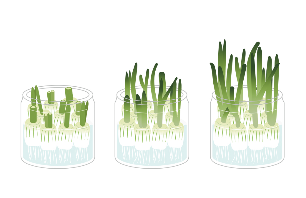 Un facile esperimento di regrowing, che entusiasmerà i bambini. Tagliate la parte finale di un cipollotto, a circa 3 cm dalle radici. Mettetela in un vasetto con l’acqua, in modo che solo le radici siano immerse. Ponete il contenitore davanti alla finestra, così che prenda