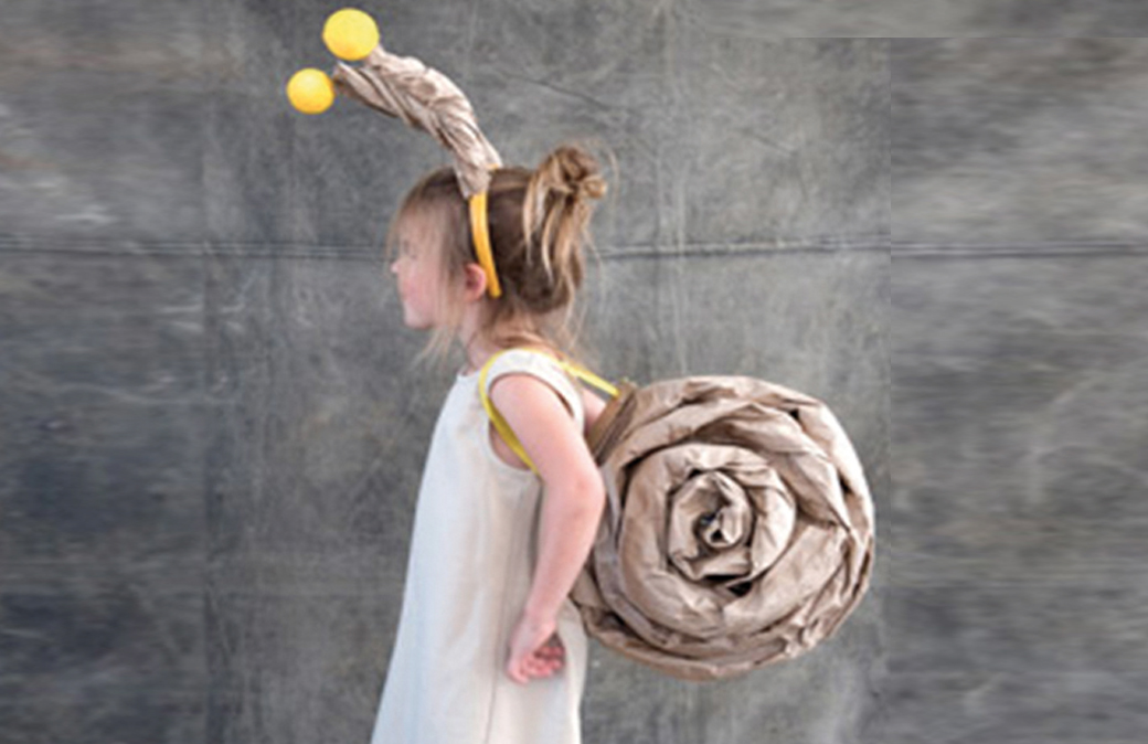 Una tunica chiara, un cerchietto, 2 palline di polistirolo e tanta carta da pacco per realizzare il guscio, che si indossa come uno zaino: ed ecco una deliziosa lumachina. 1) Taglia e accartoccia un grande pezzo di carta. 2) Partendo dall’angolo, inizia ad arrotolarlo. 3) Torci la carta su se stessa e avvolgila a spirale. 4) Via via che formi la spirale, fermala con nastro adesivo, fino a ottenere un mezzo guscio della dimensione desiderata. Fissa con punti di colla a caldo, così da eliminare il nastro adesivo. 5) Ripeti l’operazione, quindi fissa le due parti tra loro con la colla a caldo. Prendi un quadrato di cartone, fissa del nastro per creare uno zaino e incollalo sul guscio. Crea le antenne: prendi 2 pezzi di carta e accartocciali e arrotolali finché non sono rigidi e si reggono da soli. Con la colla a caldo fissa le punte alle 2 palline di polistirolo e le basi al cerchietto. (http://ohhappyday.com/2012/10/snail-costume/)