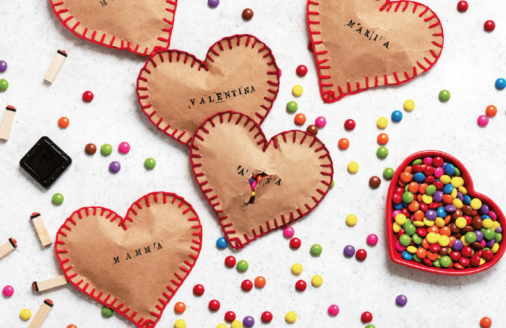 Un regalo dolce e irresistibile, facile da realizzare e di grande impatto. Basta della carta da pacchi di riciclo, su cui disegnare le sagome di tanti cuoricini, di circa 10 cm di altezza. Dopo averle ritagliate, vanno appaiate a due a due e forate lungo il perimetro, a circa un centimetro dal bordo: si può usare la perforatrice, ma va benissimo anche un grosso ago. A questo punto, si cuciono i bordi con ago e filo di lana, oppure si fa passare un cordoncino colorato. Prima di completare la cucitura, inserire una manciata di confettini colorati e poi chiudere. Volendo, si può personalizzare il pacchetto con una scritta, oppure