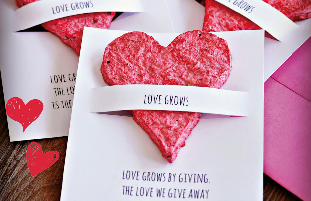 Un’idea romantica, da realizzare con la polpa di carta e qualche bustina di semi di fiori. Si comincia riducendo a piccoli pezzi delle pagine di quotidiani, carta da cucina, tovaglioli di carta. Si mette il tutto a bagno per una notte in una ciotola di acqua con del colorante alimentare rosso, poi si riduce in poltiglia con un frullatore a immersione. Ora bisogna scolare l’acqua in eccesso con un colino e poi mescolare al composto il contenuto di 2 o 3 bustine di semi di fiori. Lavorando su un grande telo asciutto, inserire piccole quantità del composto in una formina da biscotti a cuore, premere bene, togliere la formina e lasciare i cuori sul telo per circa un’ora. Trasferirli su un altro telo asciutto e fare essiccare all’aria per 24 ore, cambiando spesso il telo per evitare muffe. Da regalare in un cartoncino come nella foto, pronti per fiorire!