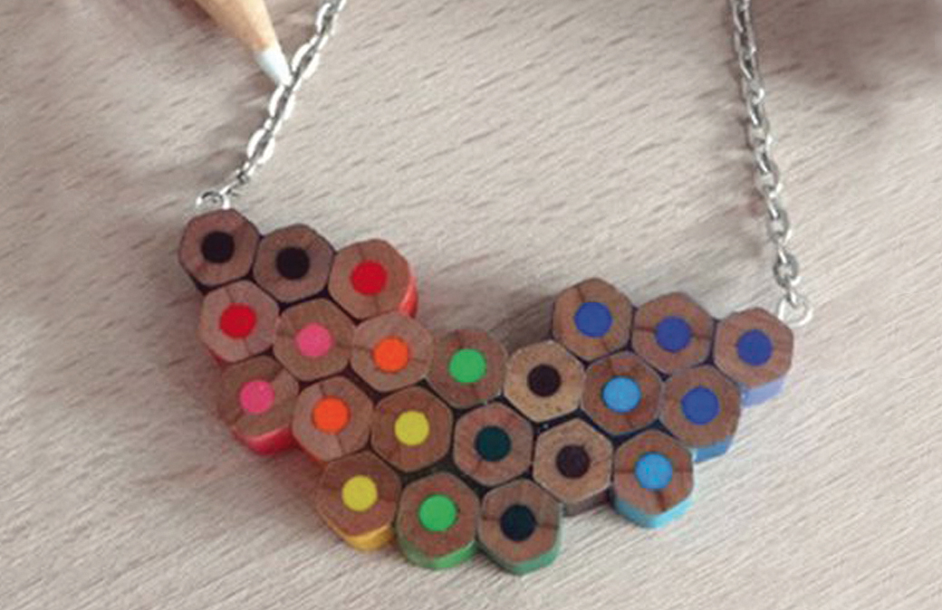 Quanti mozziconi di matite colorate ci sono nei nostri cassetti? Trasformiamoli in perline per realizzare bellissimi pezzi di bigiotteria. Con un seghetto, esercitando una lieve pressione, ricavare dalle matite dei pezzetti di circa 5-6 mm di lunghezza. Passare sulle aree di taglio della carta vetrata fine, quindi incollarli tra loro con un punto di attaccatutto. Fissare due anellini con punta a vite sui lati e agganciare a una catenina.