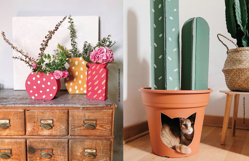 Il micio infastidisce le vostre piante? Createne una per lui, con un grande vaso di plastica, da cui sagomare con un taglierino e una lima un’apertura a forma di gatto. Un sottovaso a misura farà da tetto e da base per i due cactus, realizzati ritagliando dal cartone due coppie di sagome, da dipingere di verde, ritagliare a metà e incastrare tra loro.