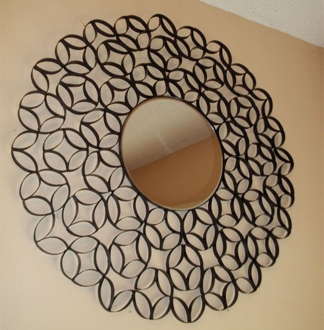 Per realizzare questa creazione ci vuole molta pazienza e tanti rotoli di cartoncino. Vanno ritagliati ad anelli di circa 1 cm, da schiacciare e colorare di nero. Gli anelli si incollano tra loro a 4 a 4, a fiore, poi si appiccicano intorno a uno specchio o a una cornice, proseguendo a incollarli tra loro man mano che si completano i giri intorno.