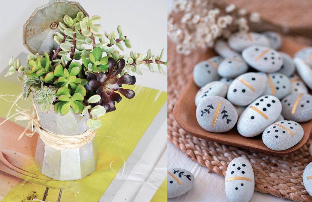 Per realizzare questo domino fai da te servono solo 28 sassolini tondeggianti e 2 pennarelli indelebili. Disegnate con un pennarello color oro una striscia nel centro di ogni sasso. Con un pennarello nero, sul primo sasso disegnate 2 rametti (è l’equivalente di 0-0), sul secondo solo 1 puntino da una parte. Al terzo disegnate 2 puntini, uno per parte. Proseguite così, con i puntini da 0 a 6 da ciascuna parte.