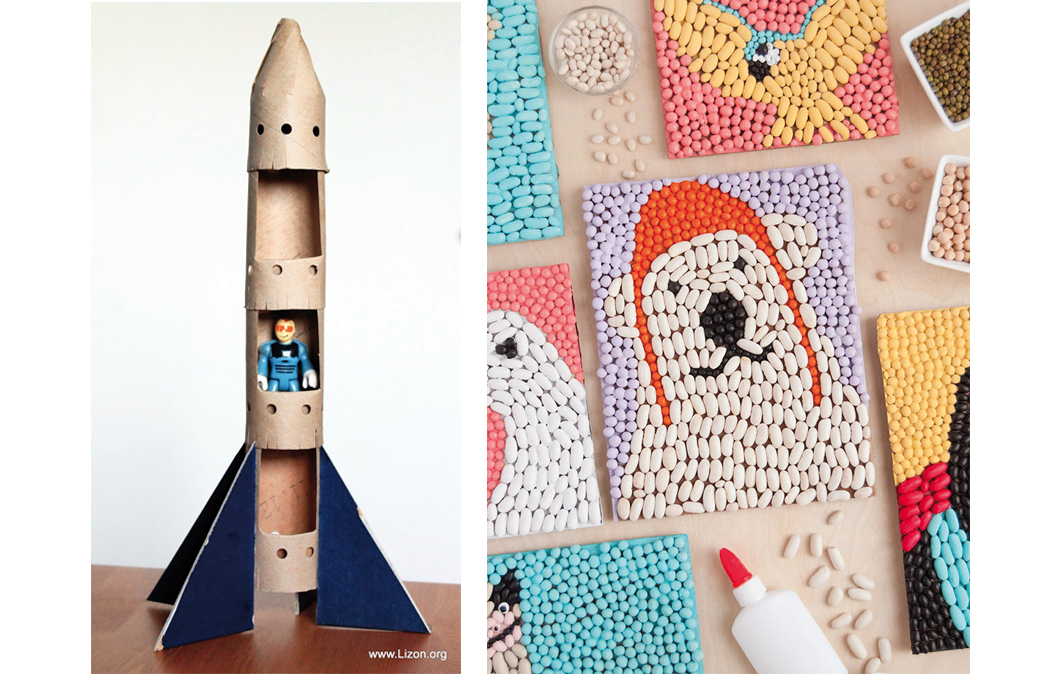 Bastano 4 rotoli interni della carta igienica per realizzare un fantastico razzo spaziale. Da 3 di loro bisogna ritagliare i 3 lati di un rettangolo, da ripiegare alla base e sistemare come fondo della cabina spaziale; con le forbici, poi, si deve “sfrangiare” il fondo, in modo che sia facile inserirli uno dentro l’altro; con una foratrice, invece, si possono realizzare dei buchi decorativi. Il quarto rotolo viene piegato per realizzare la punta del razzo; alla base vengono poi inseriti dei triangoli di cartoncino come supporto. Una volta incollati tutti i dettagli, si passa a colorare con tempere a scelta. www.lizon.org/2013/03/blog-post.html