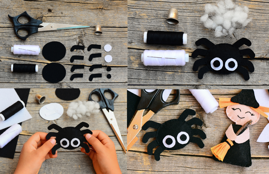 Ritagliare dal feltro 2 cerchi della dimensione del corpo del ragnetto, 8 zampette 2 cerchi bianchi, 2 neri più piccoli.
