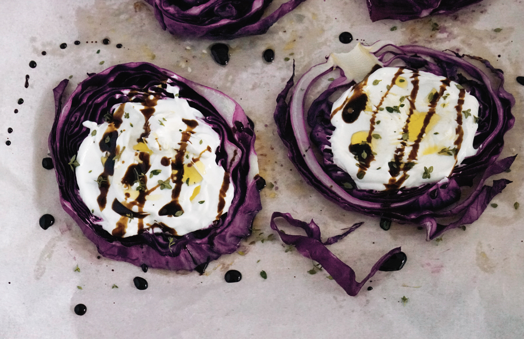 Nel frattempo preparare la salsa di yogurt, mescolando in una ciotola lo yogurt, il succo di lime, sale, pepe. Sfornare il cavolo e distribuire la salsa di yogurt sopra le fette. Servire con timo e gocce di aceto balsamico.