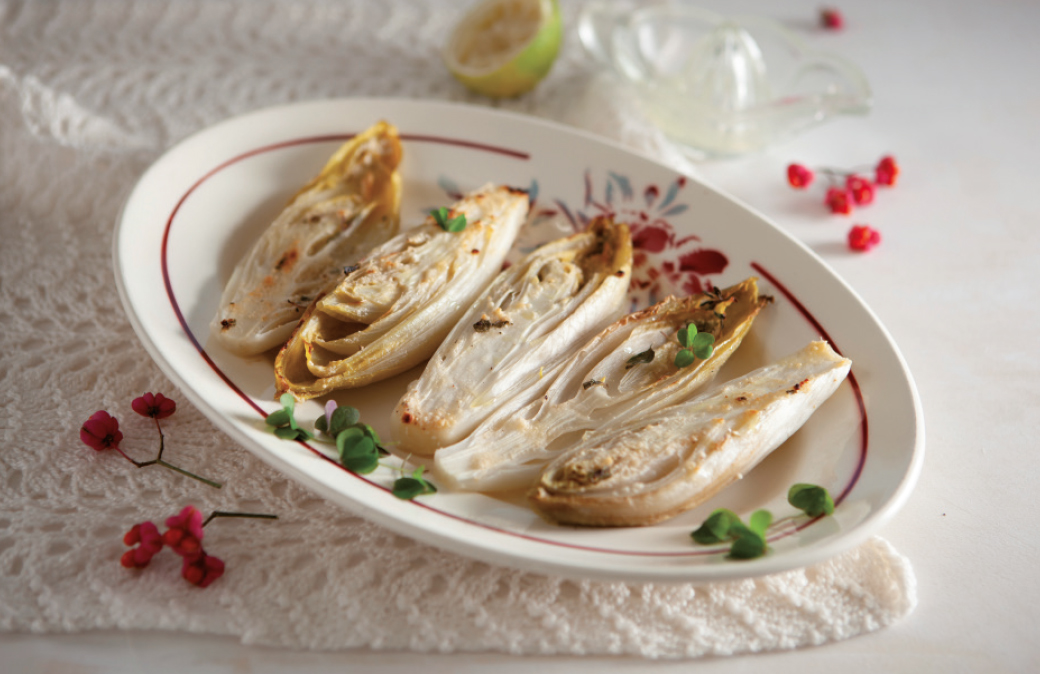 Portare a ebollizione una pentola d’acqua, tuffare l’indivia, salare. Lessare per 4 minuti o finché l’indivia risulterà tenera, scolare e asciugare, tamponare con carta assorbente. Lavare le erbe, inserirle fra le foglie dell’indivia.2