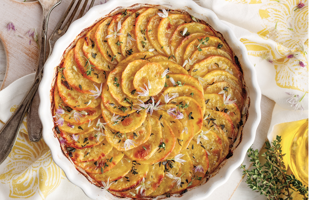 Spargere un po’ di erbe aromatiche tritate, sale e pepe, quindi sbriciolare metà della ricotta. Ricoprire con metà della salsiccia e metà delle fette di scamorza. Stendere un altro strato di fette di patate, procedere con gli ingredienti rimasti. Terminare con uno strato di patate e aromi.3