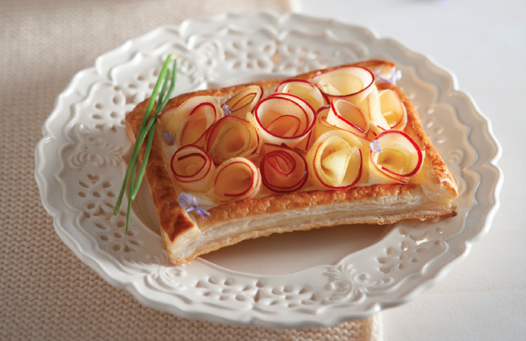 Lavorare la crème fraîche, metterla in una ciotola con qualche goccia di limone, amalgamare finché sarà cremosa, aggiungere la senape, incorporare bene. Prendere i rettangoli di pasta, disporre la crema nel guscio con l’aiuto di una spatola e completare con le rose di mela. Servire a temperatura ambiente, completare con erbe fresche a piacere.