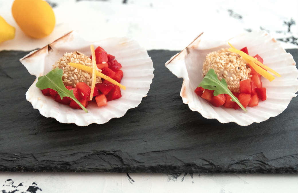 Tagliare finemente i carciofi e farli saltare pochi minuti in padella con olio, scalogno e aglio. Salare e pepare. Preparare a parte la besciamella con i semi di papavero e il sugo ristretto delle capesante. Disporre le capesante nelle loro valve.3