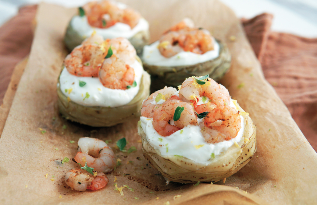 In una ciotola, mescolare lo yogurt, l’aglio e il prezzemolo sminuzzato, a seguire la buccia grattugiata del limone e il succo di metà limone, la curcuma, un po’ di sale e olio. Unire infine i pezzetti di gambi dei carciofi. Farcire i carciofi con questa salsa e completare con due gamberi ciascuno.