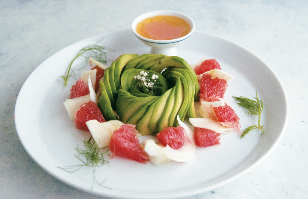 Impiattare le fettine di avocado e di finocchio, aggiungere gli spicchi di pompelmo. Condire l’insalata con l’emulsione, servire insieme alla maionese aromatizzata con la curcuma.