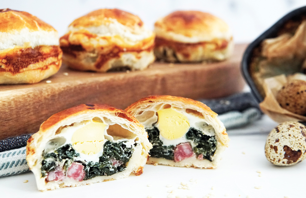 Stendere la pasta sfoglia e con il coppa pasta ricavare 12 cerchi. Inserirne 6 (tenendo gli altri da parte) in altrettanti pirottini di alluminio, facendo qualche buchino con la forchetta. Aggiungere il ripieno e, con il dorso di un cucchiaino, pressare al centro formando un avvallamento. Rompere un ovetto per volta e posizionarlo dentro l’avvallamento.3