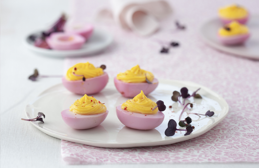 Sgusciare le uova, coprirle con l’acqua alla barbabietola. Sigillare con una pellicola per alimenti e lasciare riposare in frigorifero per una notte. A questo punto asciugare delicatamente le uova, tagliarle a metà, raccogliere i tuorli in un mixer insieme alla maionese, alla senape e all'aceto di vino bianco, aggiungere una macinata di pepe, frullare per ottenere una crema liscia.3