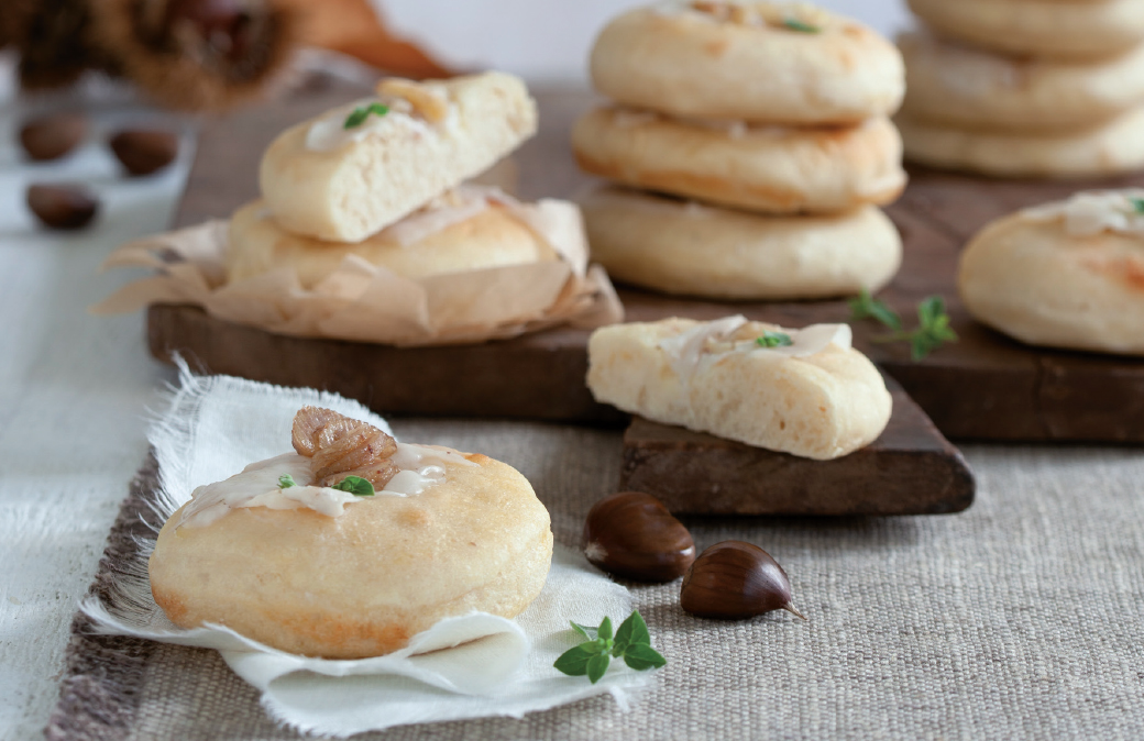 Trascorso il tempo necessario, spennellare con un filo d’olio i bordi e mettere al centro di ogni impasto un pezzetto di crescenza. Distribuire una fettina di lardo e una castagna su ogni pizzetta.3