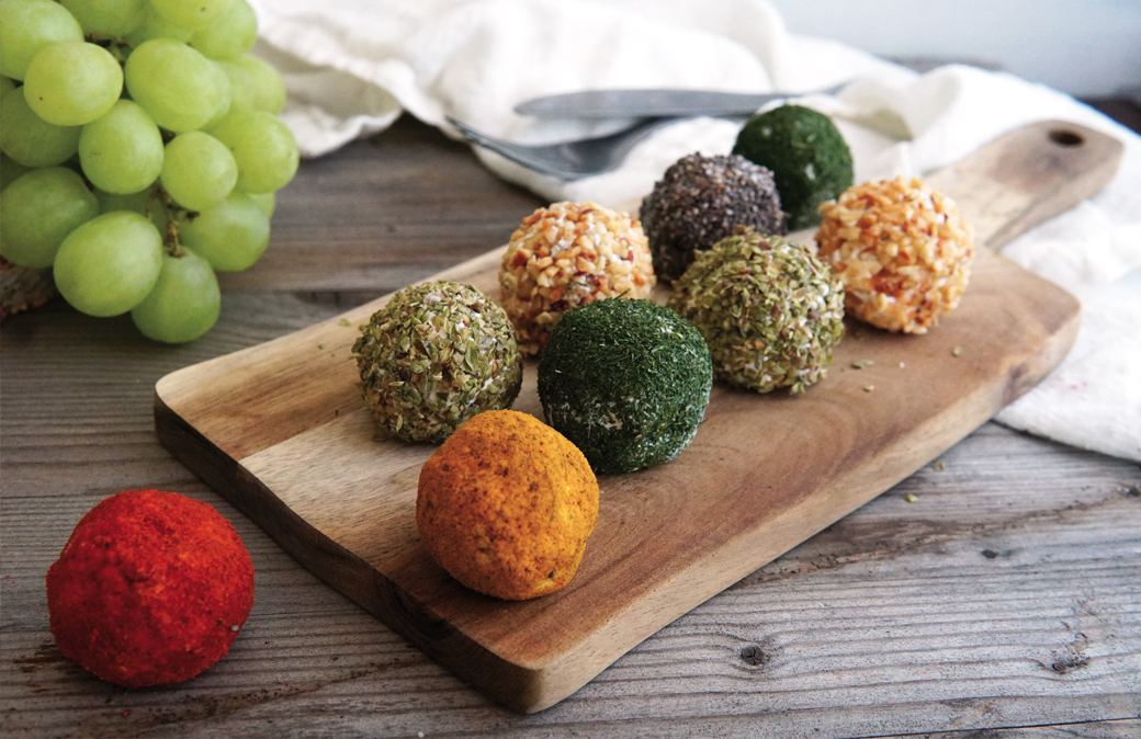 Passare le palline a scelta nella paprika, nel basilico, nella curcuma, nell’aneto, nei semi di papavero e nelle noci tritate. Conservare in frigo fino al momento di servire.