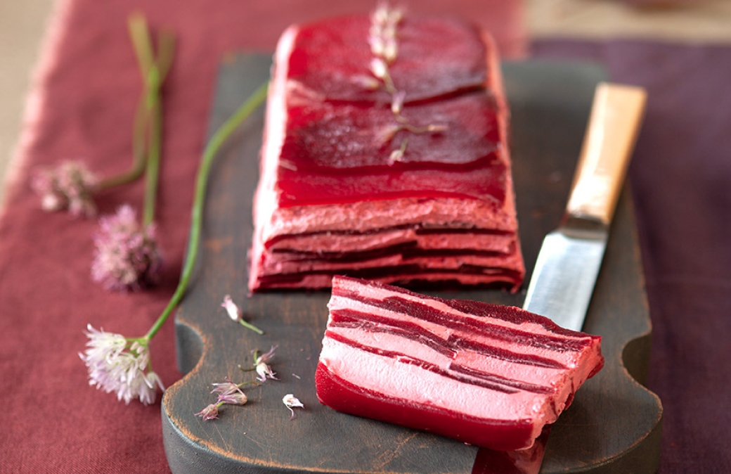 Spennellare con poco olio uno stampo rettangolare o da plumcake, rivestirlo con pellicola trasparente, lasciandola sbordare ai lati (servirà per sigillare la terrina). In una ciotola unire il formaggio cremoso al formaggio di capra, mescolare energicamente per renderli morbidi, aggiustare di sale, insaporire con le erbe a piacere. Lasciare riposare al fresco. Prendere le barbabietole, privarle della buccia esterna e con l’aiuto di una mandolina affettarle sottilmente. In alternativa, si può utilizzare un coltello affilato.2