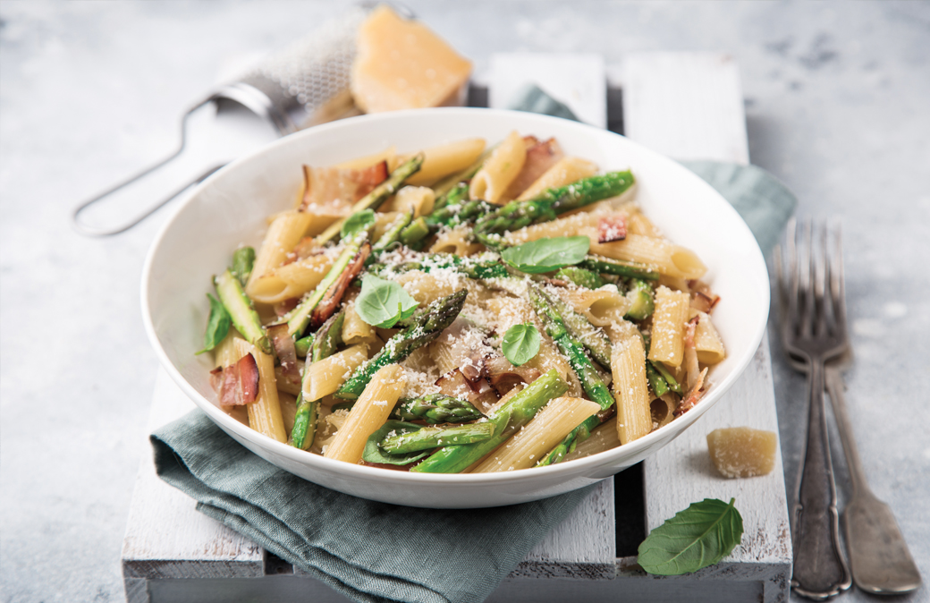Intanto, cuocere la pasta in abbondante acqua bollente salata, per 6-8 minuti. Scolare le penne, condirle con la crema di asparagi, aggiungendo qualche cucchiaio di acqua di cottura della pasta. Unire le striscioline di speck, le punte di asparago e qualche fogliolina di menta. Servire con abbondante parmigiano grattugiato.