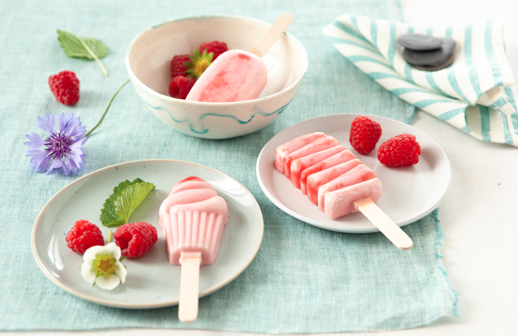 Per servire, immergere rapidamente gli stampi in acqua tiepida e sformare i ghiaccioli. Servire a piacere in ciotoline con lamponi e erbe aromatiche. N.B.: se si utilizzano degli stampi di silicone, non è necessario immergerli in acqua per porzionarli.