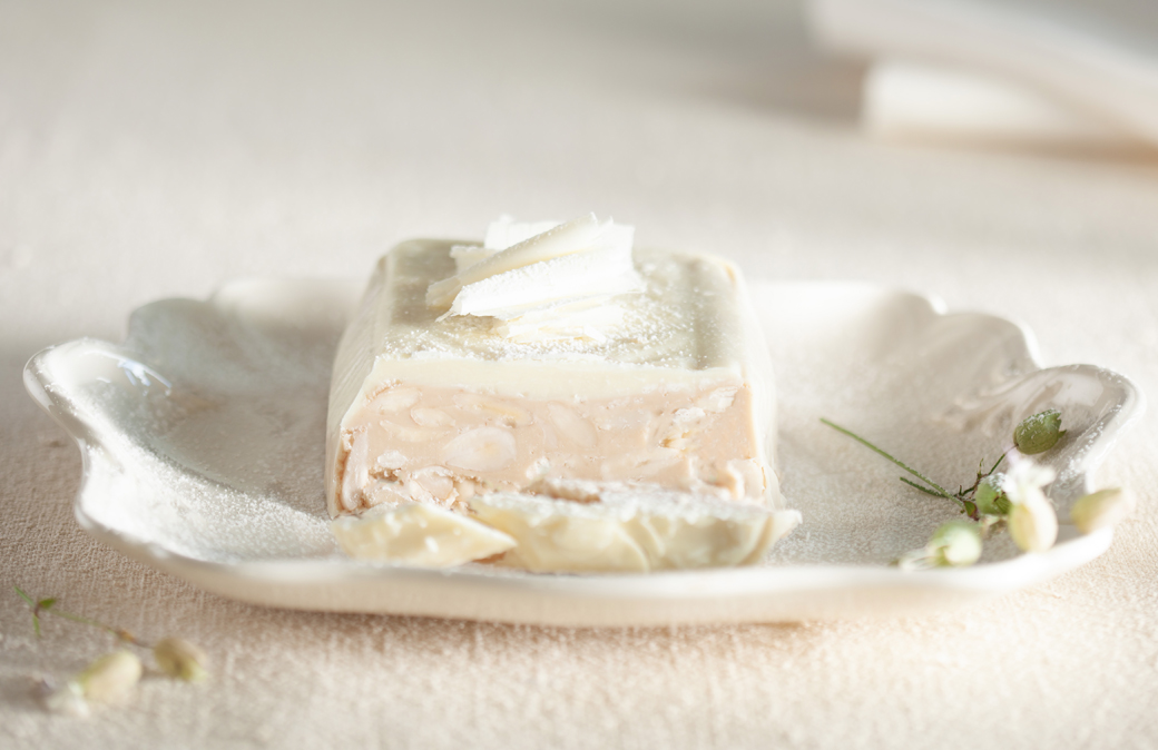 Prelevare lo stampo dal frigorifero e versarvi dentro il composto. Livellare con cura e rimettere in frigo a solidificare per almeno 3 ore: meglio per una notte intera, se c’è tempo. Prendere il mandorlato ed eliminare lo stampo in alluminio: incidere con una forbice gli angoli per liberare il dolce dall’involucro con facilità. Mettere su un vassoio e servire a temperatura ambiente.