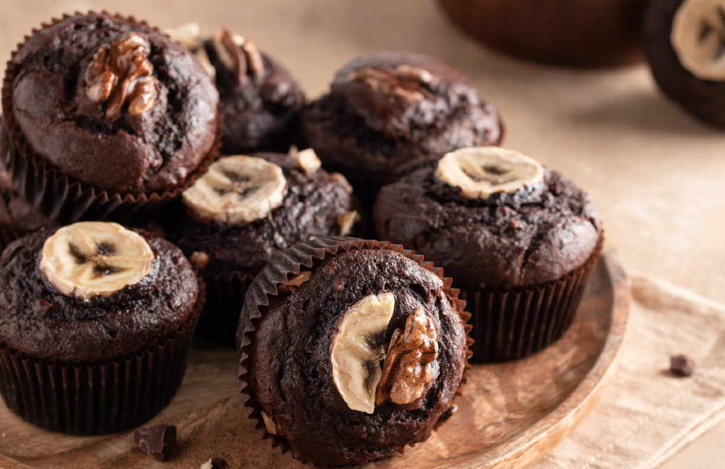Nel frattempo, sbucciare la banana rimasta, tagliarla a fettine non troppo sottili e irrorarle con il succo di limone per evitare che anneriscano. Quando i muffin sono cotti, estrarli dal forno e lasciarli raffreddare prima di toglierli dai pirottini. Servirli decorati con una o più fettine di banana al limone e qualche gheriglio delle noci rimaste.