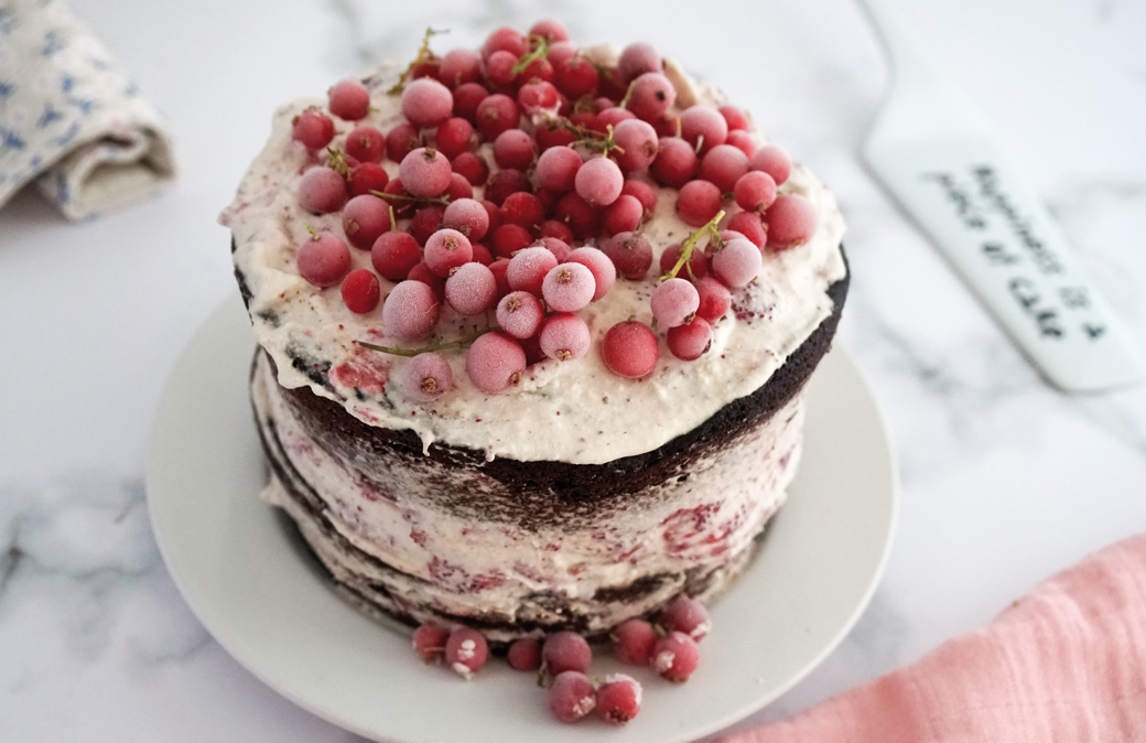Sformare le due torte, livellare con un coltello la parte superiore. Posizionare il primo disco su un vassoio e spalmarvi sopra la crema creando uno strato alto. Appoggiare sopra il secondo disco, ricoprendolo con la crema restante. Passare tutto intorno con la spatola per pareggiare la farcia. Decorare con i ribes congelati e lasciare la torta in frigo almeno 2-3 ore prima di servirla.