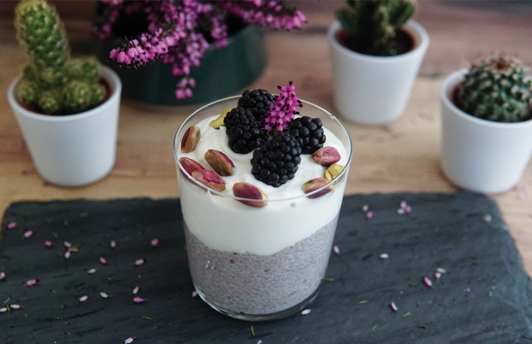 Ripartire in 4 bicchierini e riporli in frigo, coperti con la pellicola trasparente. Lasciare tutta la notte, in modo che la chia si gonfi assorbendo il latte.3