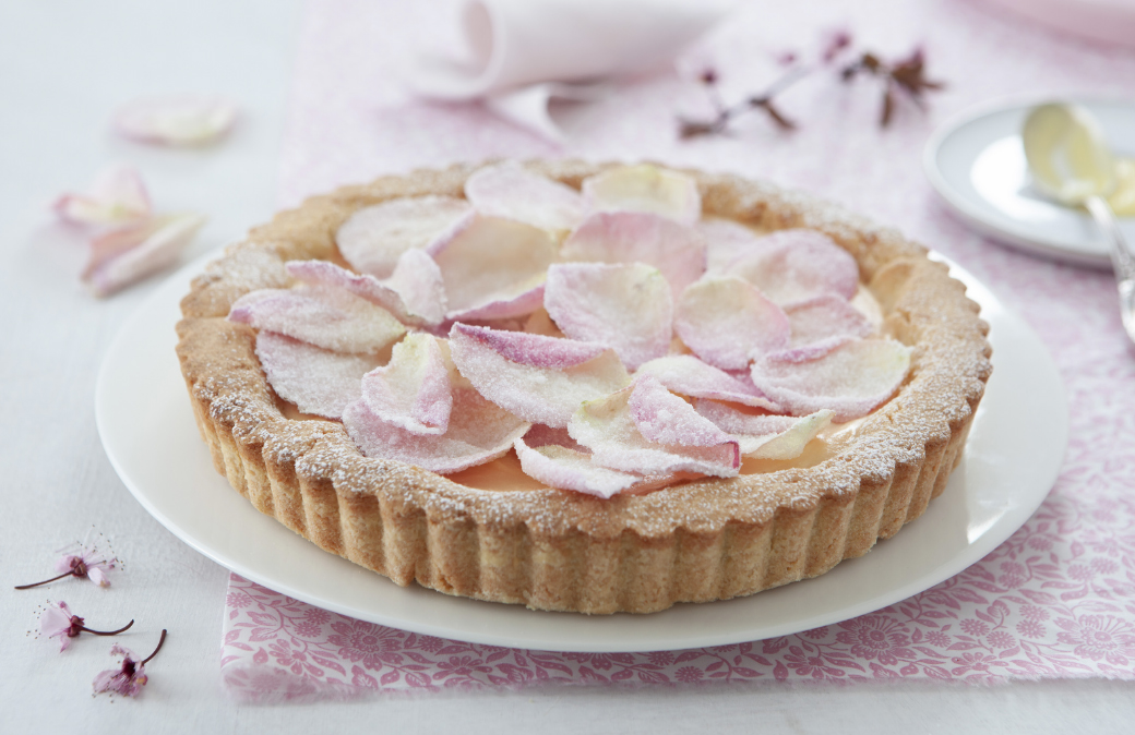 Per prima cosa, candire i petali di rosa. In una ciotola, montare l’albume fino a quando sarà spumoso. Lavare ed asciugare i petali dopo averli separati dallo stelo. Spennellarli con l’albume e cospargerli con lo zucchero sino a ricoprirli completamente. Metterli su una gratella per una notte in un luogo fresco e farli asciugare finché diventano croccanti. Preparare la pasta frolla. Lavorare brevemente il burro freddo tagliato a cubetti con lo zucchero, utilizzando una frusta a foglia della planetaria oppure un mixer. Una volta ottenuto un composto bricioloso, aggiungere i tuorli uno alla volta, unire il pizzico di sale, la vanillina, la scorza del limone e la farina setacciata. Impastare il tanto che basta a ottenere una palla omogenea, controllando che il burro si sia incorporato bene. In alternativa, impastare a mano utilizzando una capiente ciotola. Formare un panetto, avvolgerlo e lasciare riposare in frigorifero per 30 minuti.2