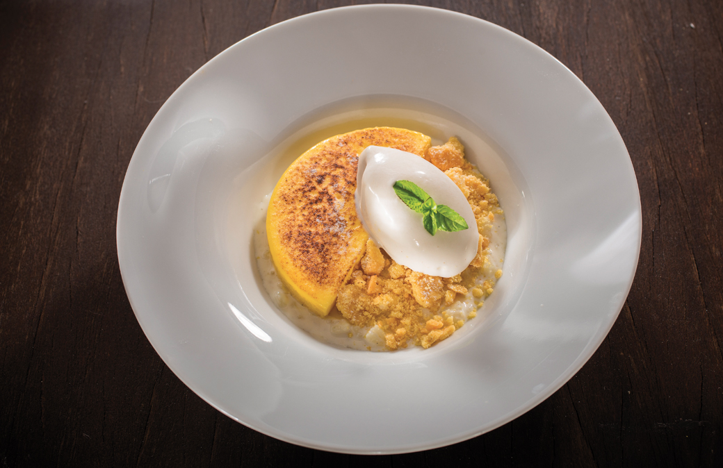 Streusel alle mandorle: in planetaria miscelare zucchero a velo, farina, farina di mandorle e, poco alla volta, il burro freddo. Abbattere a -18°C e cuocere a 170°C per 12 minuti. Al momento di “impiattare”, stendere la crema chiboust come “letto” per la torta di riso vera e propria, quindi porre lo streusel alle mandorle a fianco e la meringa sopra.