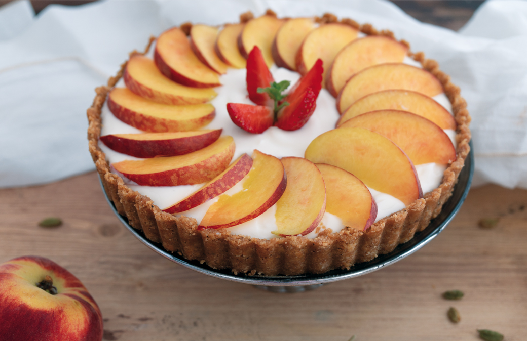 Versare la crema sopra la base raffreddata. Livellare e lasciarla riposare in frigo per 3 ore. Guarnire con le pesche a fette, la fragola e la menta.